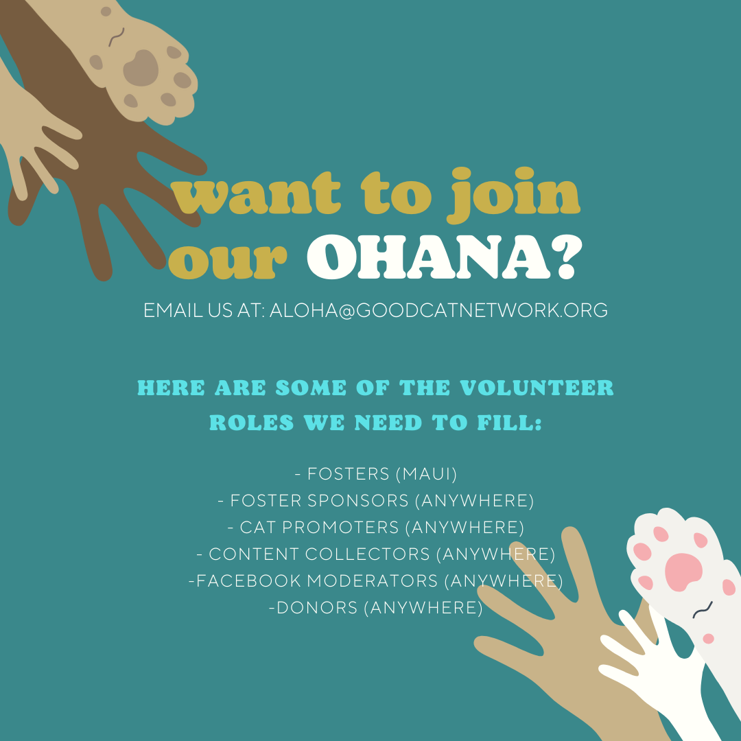 Good Cat Network has also collaborated with local native species non-profits such as Maui Nui Seabird Restoration and Maui Forestbird Restoration, with future plans to expand the Operation Aloha Cat program. Good Cat Network hopes to continue the discussion with the public and community leaders, focusing on new research and innovative ways to humanely reduce the feral and community cat populations in Hawaiʻi.
